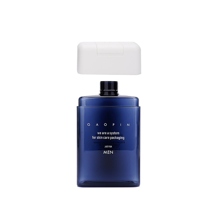 ขวดเปล่าป้องกันการดูแลส่วนบุคคล ตัวขวดสีน้ำเงินพร้อมฝาพลิกสีขาว สี่เหลี่ยมสามารถเลือกความจุได้หลากหลาย เหมาะกับของใช้ในชีวิตประจำวัน เช่น เจลอาบน้ำ แชมพู เจลล้างมือ ฯลฯ..